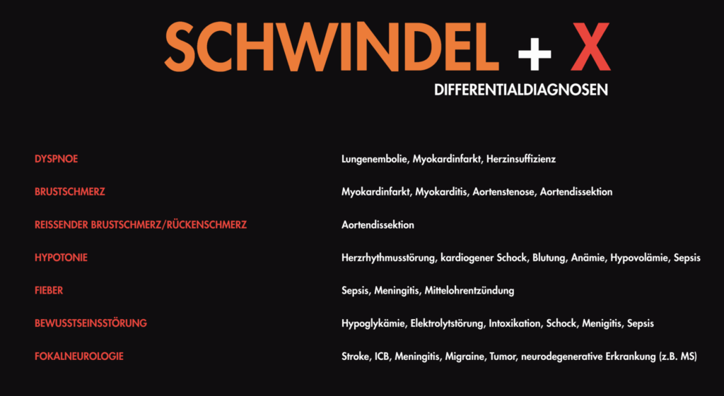 Schwindel tritt meist nicht alleine auf. Gerade wenn es mit einem nicht neurologischen ABC-Problem auftritt, ist eine zentrale Genese oft nicht sehr wahrscheinlich. Hinter den unten genannten Symptomkombinationen können sich viele gemeine Dinge verbergen. Um euch daran denken zu lassen – hier ein paar Differentialdiagnosen :