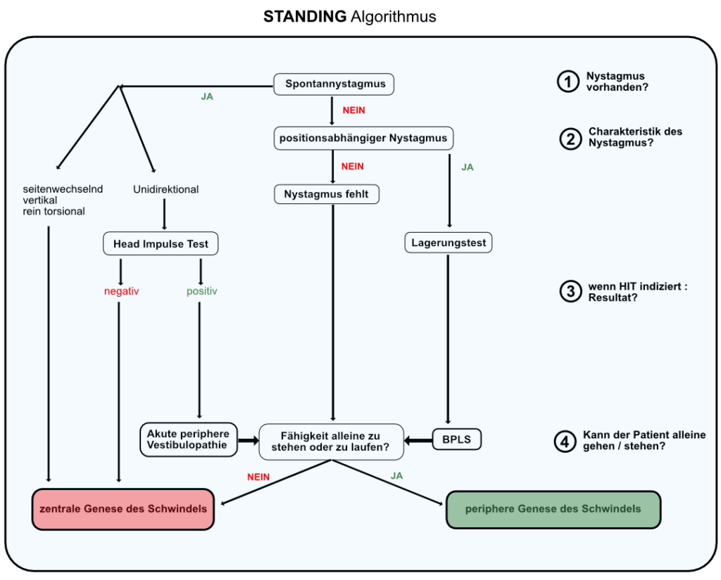 Der Standing Algorithmus entstand aus einer Zusammenarbeit von Notfallfallmedizinern und Schwindelspezialisten um in der Notaufnahme eine einfache Handlungsanweisung zur Verfügung zu haben um sicher zwischen zentrale und peripheren Ursachen eines Schwindels zu unterscheiden. [37–39]